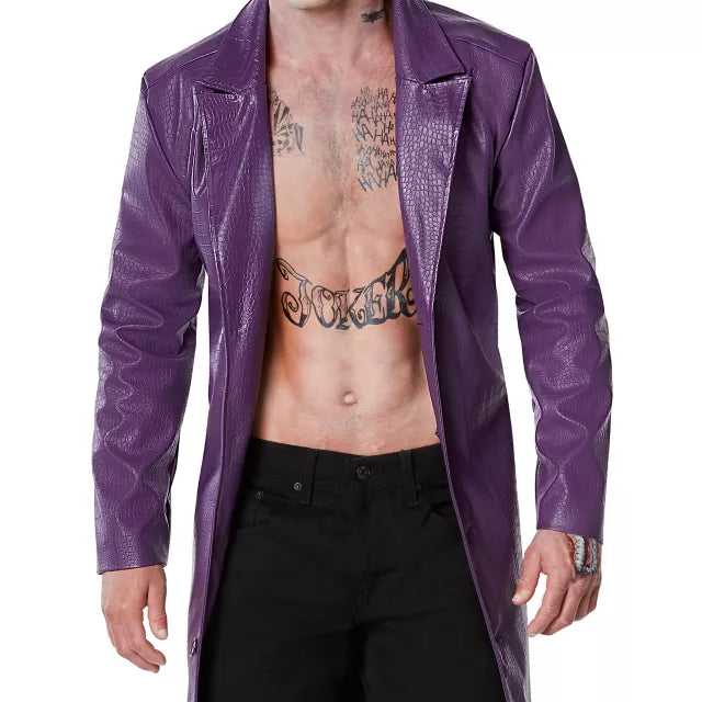 Unleash your inner villain with the Adult Joker Jacket from Suicide Squad, inspired by Jared Leto’s unforgettable portrayal of the Clown Prince of Crime. This striking long purple leather coat captures the chaotic and menacing style of the Joker, making it the perfect choice for Halloween, cosplay events, comic conventions, or collectors.