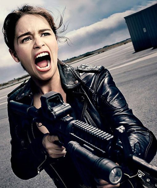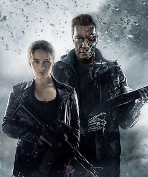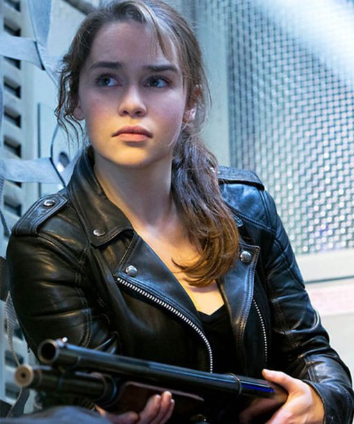 The Sarah Connor Terminator Genisys Leather Jacket is the iconic piece worn by Emilia Clarke as Sarah Connor in Terminator Genisys alongside Arnold Schwarzenegger. This premium jacket elevates your style with a bold, biker-inspired design. Ideal when paired with jeans and heels, it combines celebrity appeal with practical fashion. Explore the detailed images to appreciate its distinctive and stylish features, perfect for fans and fashion enthusiasts alike.